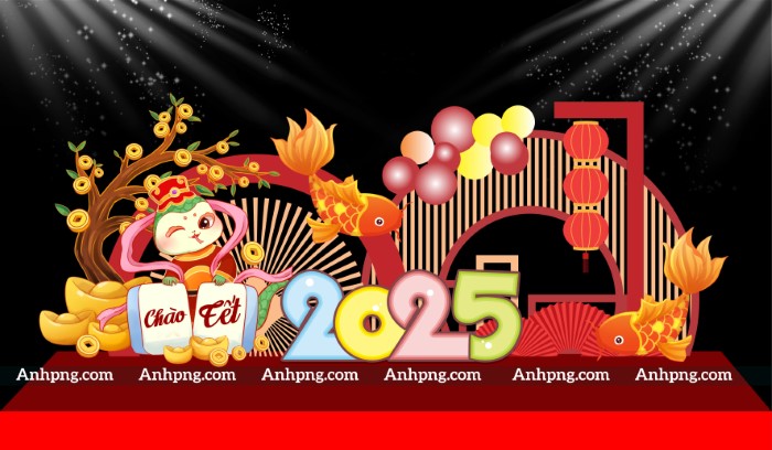 Decor Tết 2025 được thiết kế tinh tế với hình ảnh cá chép vàng, cây tài lộc và các chi tiết trang trí xuân nổi bật. Đây là mẫu tiểu cảnh lý tưởng để trang trí các sự kiện mừng xuân Ất Tỵ như khu vực check-in Tết, chương trình lễ hội và tổng kết cuối năm.